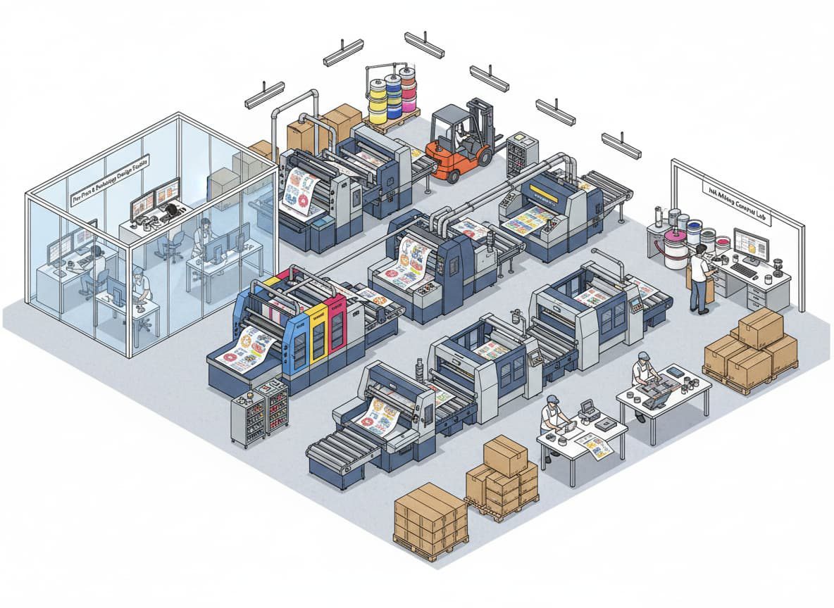 in-house packaging development studio, artwork adaptation, structural design, mockups.Post-press & Value Addition.